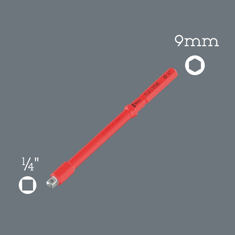 Yalıtımlı adaptör bıçak. 9 mm erkek altıgen- 1/4" kare erkek dönüştürücü bıçak. Yalıtımlı Wera Kraftform Kompakt VDE geçmeli değişken uçlu tornavidalar ile 9 mm altıgen bağlantılı bıçaklar kullanılabilir. Yalıtımlı Wera 1/4" lokmalar ve 1/4" bits lokmalar için uygundur. Tüm aletler IEC 60900 uyarınca 10.000 V'ta ayrı ayrı test edildiği için 1.000 V'a kadar gerilimlerde güvenli çalışma garanti edilmektedir.