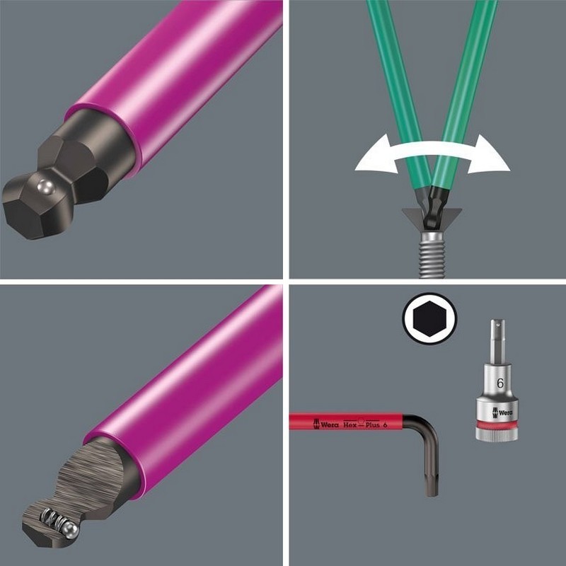 Wera 950/9 SPKL HF HexPlus Topbaş Alyan Seti 05022210001 iki parçalı klips içinde 9 adet alyan anahtarını barındırmaktadır. Farklı çalışma alanlarında iş yapabilmek ve tork gücünü farklı aktarabilmek için alyan anahtarlarında L şeklinde farklı uzunlukta iki kol bulunmaktadır. Wera 950/9 SPKL HF HexPlus Topbaş Alyan Seti 05022210001 altıgen uca sahip olup, 3 numara ve üzerindeki anahtarlarda uzun koldaki altıgen baş yuvarlatılmış topbaş şeklindedir. Yuvarlatılmış topbaş sayesinde Wera 950/9 SPKL HF 05022210001 alyan anahtarları açılı kullanmak mümkündür. Plastik kaplı renk kodlamasıyla anahtarları ayırt etmek ve bulmak çok kolaydır. Wera 950/9 SPKL HF HexPlus Topbaş Alyan Seti 05022210001'ndeki alyan anahtarların uzun kolunda vidayı tutmak için Wera tarafından HF: Holding Function olarak adlandırılan tutma fonksiyonu bulunmaktadır. HF. Tutma fonksiyonu alyan anahtar ucundaki mini bilye ile sağlanmaktadır. Wera 950/9 SPKL HF HexPlus Topbaş Alyan anahtarları siyah lazerler işlendiğinden korozyon ve yıpranmaya karşı ekstra güçlendirilmiştir.