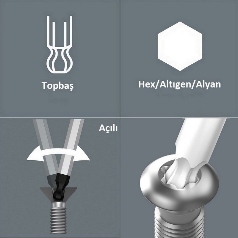 - Yuvarlak altıgen topbaş sayesinde açılı kullanma imkânı;