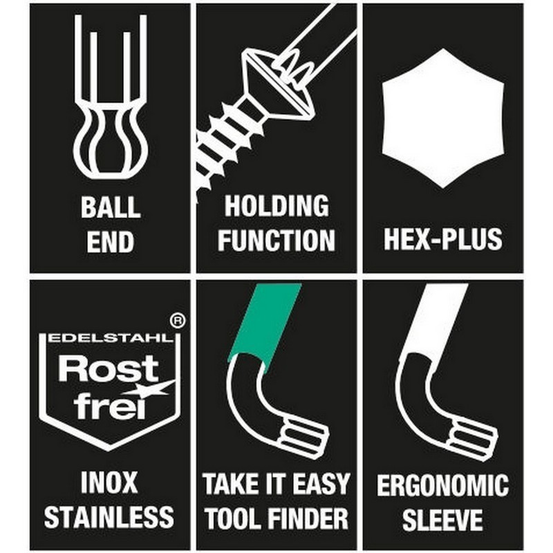 Wera 3950/9 SPKL HF HexPlus Topbaş Alyan Seti 05022699001 iki parçalı klips içinde 9 adet alyan anahtarını barındırmaktadır. Farklı çalışma alanlarında iş yapabilmek ve tork gücünü farklı aktarabilmek için alyan anahtarlarında L şeklinde farklı uzunlukta iki kol bulunmaktadır. Wera 3950/9 SPKL HF HexPlus Topbaş Alyan Seti 05022699001 hexplus uca sahip olup, anahtarlarda uzun koldaki altıgen baş yuvarlatılmış topbaş şeklindedir. Yuvarlatılmış topbaş sayesinde alyan anahtarı açılı kullanmak mümkündür. Plastik kaplı renk kodlamasıyla Wera 3950/9 SPKL HF HexPlus Topbaş Alyan Seti 05022699001 içindeki anahtarları ayırt etmek ve bulmak çok kolaydır. Wera 3950/9 SPKL HF HexPlus Topbaş Alyan Seti 05022699001 soğuk vakumlu sertleştirildiğinden korozyon ve yıpranmaya karşı ekstra güçlendirilmiştir.