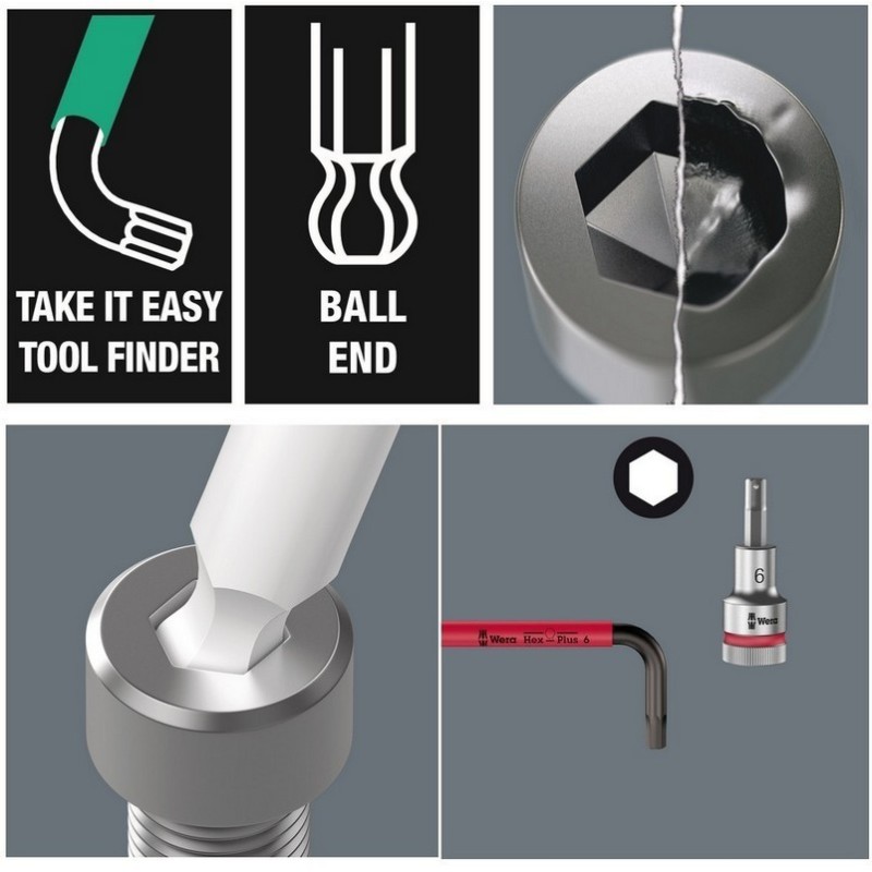 Wera 950/9 SPKL Renkli HexPlus Topbaş Allen Set 3 Mıknatıslı 05133165001 iki parçalı klips içinde 9 adet alyan anahtarını barındırmaktadır. Farklı çalışma alanlarında iş yapabilmek ve tork gücünü farklı aktarabilmek için alyan anahtarlarında L şeklinde farklı uzunlukta iki kol bulunmaktadır. Wera 950/9 SPKL Renkli HexPlus Topbaş Allen Set 3 Mıknatıslı 05133165001 05133165001 hexplus uca sahip olup, anahtarlarda uzun koldaki altıgen baş yuvarlatılmış topbaş şeklindedir. Yuvarlatılmış topbaş sayesinde alyan anahtarı açılı kullanmak mümkündür. Plastik kaplı renk kodlamasıyla Wera 950/9 SPKL Renkli HexPlus Topbaş Allen Set 3 Mıknatıslı 05133165001 içindeki anahtarları ayırt etmek ve bulmak çok kolaydır. Wera 950/9 SPKL Renkli HexPlus Topbaş Allen Set 3 Mıknatıslı 05133165001 siyah lazerler işlendiğinden korozyon ve yıpranmaya karşı ekstra güçlendirilmiştir.