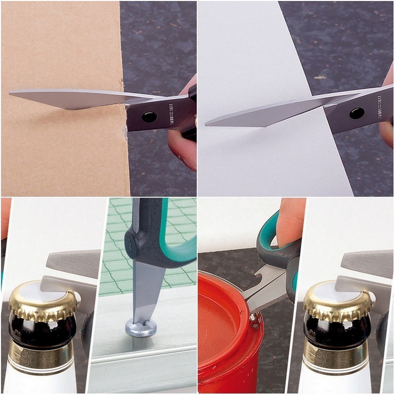 Her evde bulunması gereken bir makas: Akıllı ilave fonksiyonlarla 4 kullanışlı yardımcı tek bir alette bir arada sunulur. Üniversal ev makası bu sayede yalnızca kağıt, mukavva, folyo ve diğer birçok malzemeyi kesmek için değil, ayrıca şişe ve kapsüllerin açılması için ve bir tornavida olarak da kullanılabilir. 2 bileşenli kaymaz plastikten üretilmiş ergonomik biçimli tutma bölgeleri sayesinde makas her kullanımda ele konforlu bir şekilde oturur. Yüksek performanslı kesim geometrisi ile kağıt, karton, folyo ve diğer birçok malzemenin temiz ve hassas kesimi güvence altına alınır. Mutfak çekmecenizin kapasitesini artıracak ve ev bütçesinde tasarruf sağlayacak üniversal bir yardımcı.