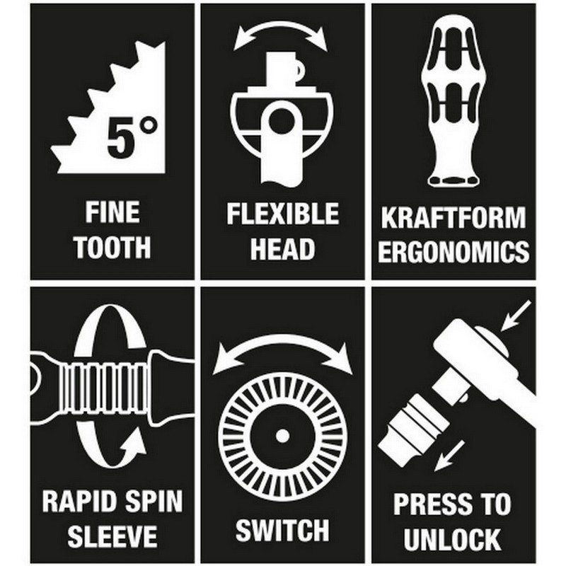 Wera’dan oynar başlıklı Zyklop cırcır. 1/2" kare lokma tutucu (sürücü) özelliğe sahiptir. Wera oynar başlıklı Zyklop cırcır 72 ince dişe yani 5°'lik çalışma açısı sağlar. Cırcır kafası serbestçe döner ve her iki tarafta bulunan sürgülü anahtar kullanılarak herhangi bir konuma kilitlenebilir. Geliştirilmiş el açıklığı ile çok dar ve erişilmesi zor alanlarda bile rahatça çalışmak mümkündür. Sağa ve sola 0°, 15° ve 90° önceden tanımlanmış kilitleme konumları, herhangi bir kayma olmadan güvenli çalışmayı sağlar. Wera oynar başlıklı Zyklop cırcır 0° konumunda geleneksel bir tornavida olarak kullanılabilir. Kraftform sapının olağanüstü tasarımı ele mükemmel bir şekilde oturur, kabarcıklar veya nasır gibi el yaralanmalarını önler. Sap için kullanılan sert malzemeler, herhangi bir cilt "yapışması" tehlikesi olmadan elin hızlı ve kolay yeniden konumlandırılmasını sağlar. Wera oynar başlıklı Zyklop cırcır torkun düşük kayıplı aktarımını sağlar.