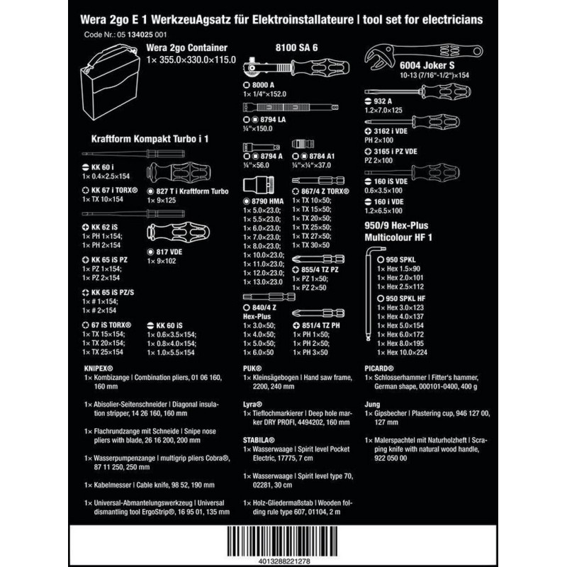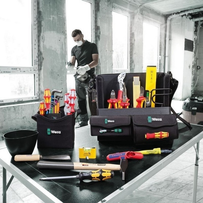 Wera, Jung, KNIPEX®, Lyra®, PICARD®, PUK® ve Stabila® ürünleri ile elektrikçiler için en önemli 73 aleti içeren kompakt alet seti Wera 2go E1 Elektrikçi Alet Seti 05134025001. Wera 2go sisteminin kompakt alet kabı sayesinde taşınabilirlik önemli ölçüde kolaylaştırılmıştır.