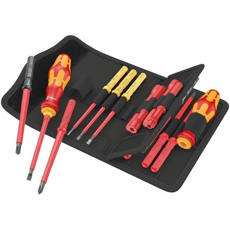 2 geçmeli tornavida sapı 817 VDE Kraftform, 12 adet VDE değiştirilebilir geçmeli uçlu (bıçaklı) "Take it Easy" alet bulucu: profillere göre renk kodlaması ve lazerle oyulmuş ölçü bilgileri - gerekli aletin kolay ve hızlı bulunması için. 4 adet kontrol kabini anahtarı. IEC 60900 standardına göre ayrı ayrı test edilmiş aletler. Onaylı 1.000 voltluk gerilimde güvenli çalışma için 10.000 voltta ayrı ayrı test. Sağlam bel çantasında. Kumaş çantanın arka tarafında polar bölge bulunmaktadır. Kumaş çanta, birlikte verilen kendinden yapışkanlı cırtcırt şerit kullanılarak Wera 2go bileşenlerine takılabilir. Veya duvarda, rafta veya takım dolabında.