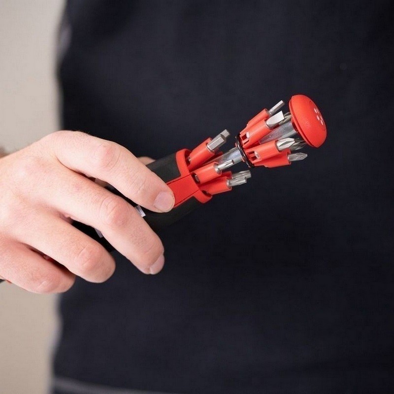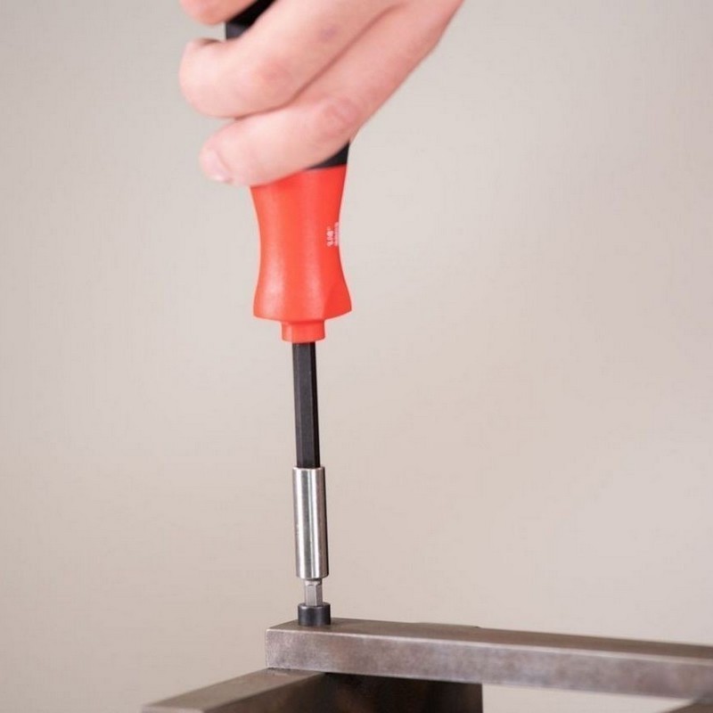 It's not uncommon for tradesmen out on jobs to need a screwdriver with a specific profile but not have the precise one within reach when they need it. The Wiha screwdriver with the LiftUp 25-bit magazine puts an end to such problems, because with only one tool you have 12 different drives at hand anytime, anywhere. LiftUp thus replaces an entire screwdriver set. At the press of a button, the bit magazine at the handle end comes out, delivering the 25 mm bits with a 1/4" drive ready for removal. The contained standard bits can be used for both manual and machine operation. Thanks to its large volume, the ergonomically shaped two-component handle ensures optimum power transmission and maximum torque values. Powerful screw fastening or loosening is therefore particularly easy for the hand.